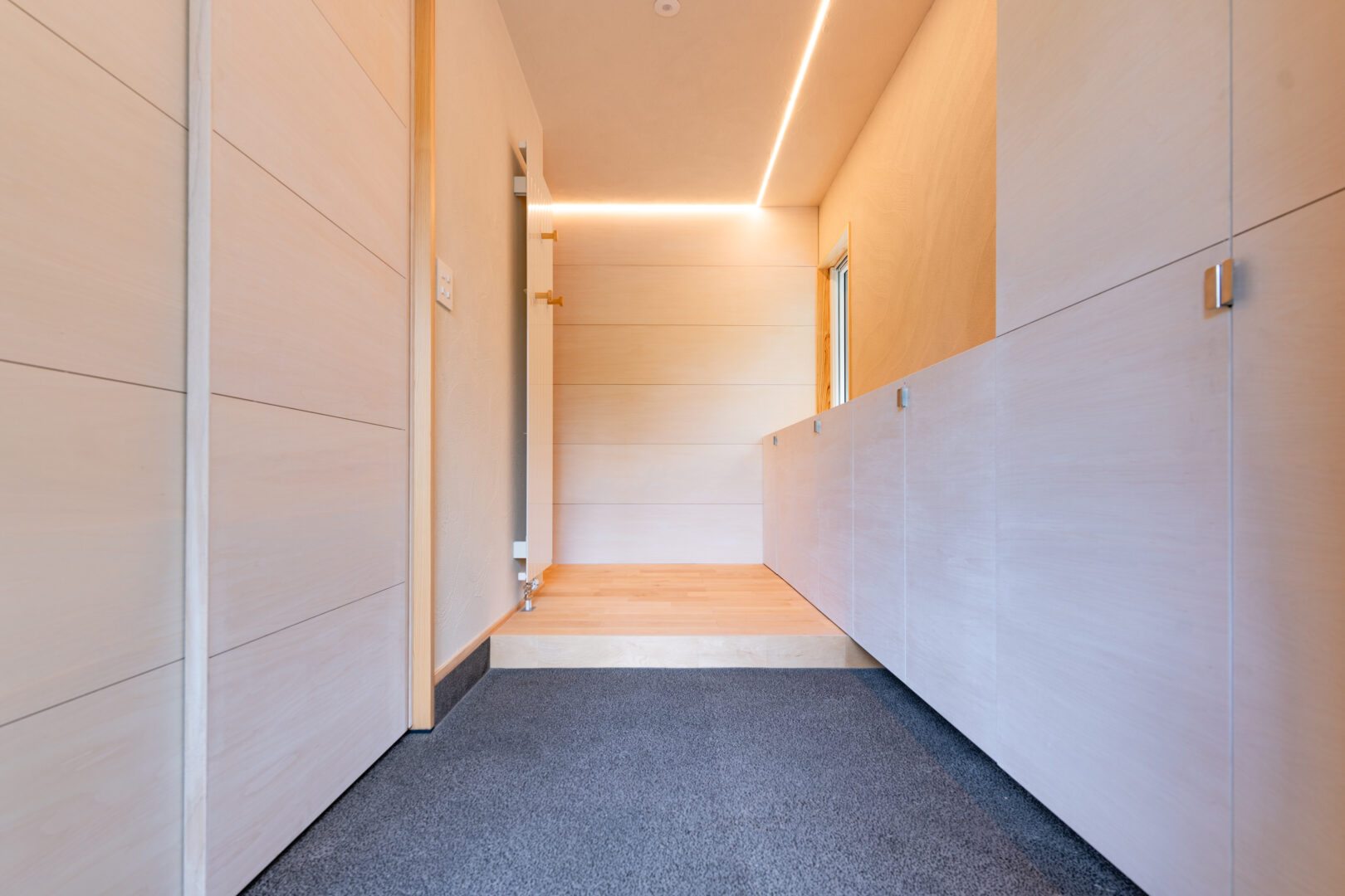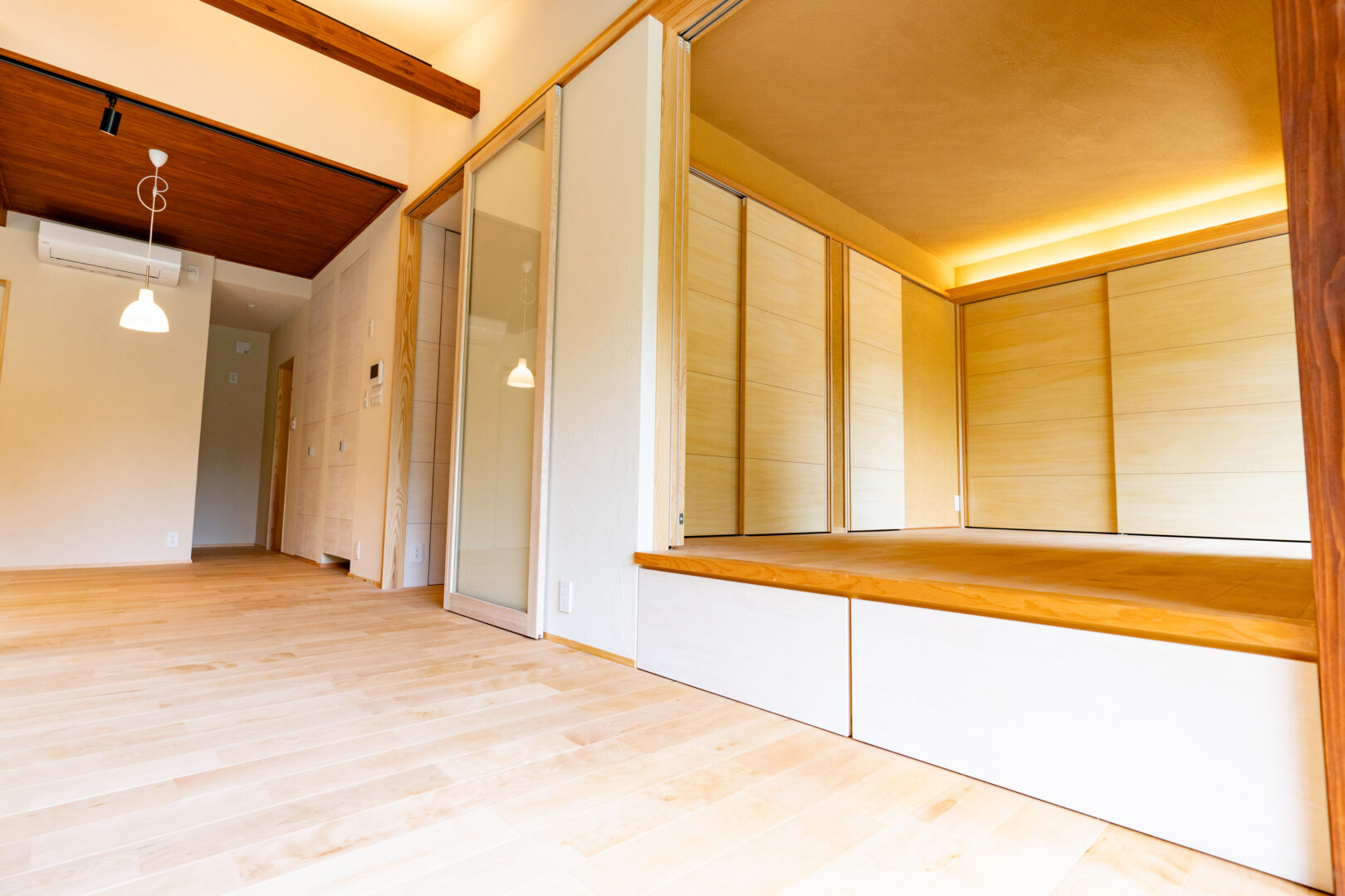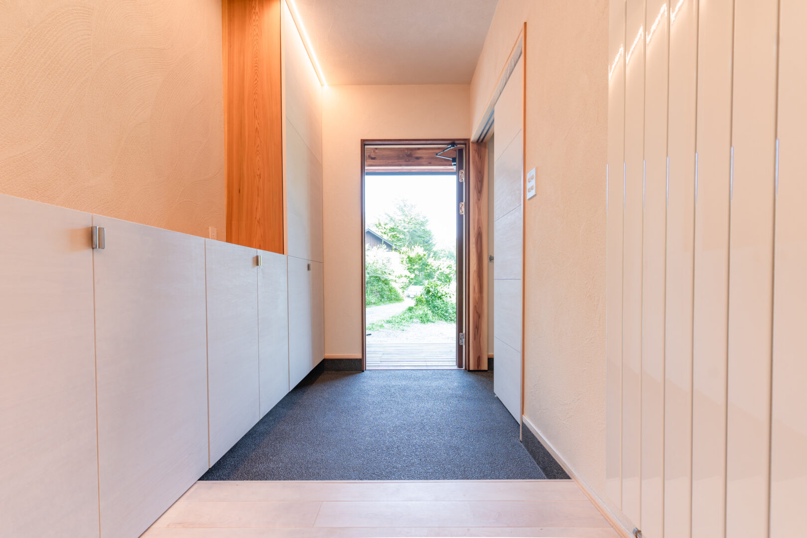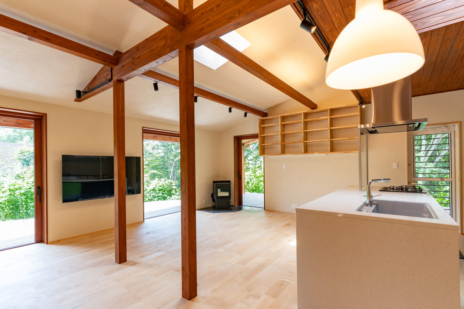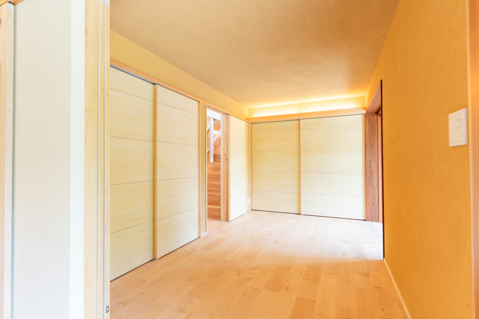 WB工法で窓を閉めても湿度はこもらない仕組みだけでなく、内装は珪藻土を塗り、パネルヒーターやペレットストーブでより快適となっています。