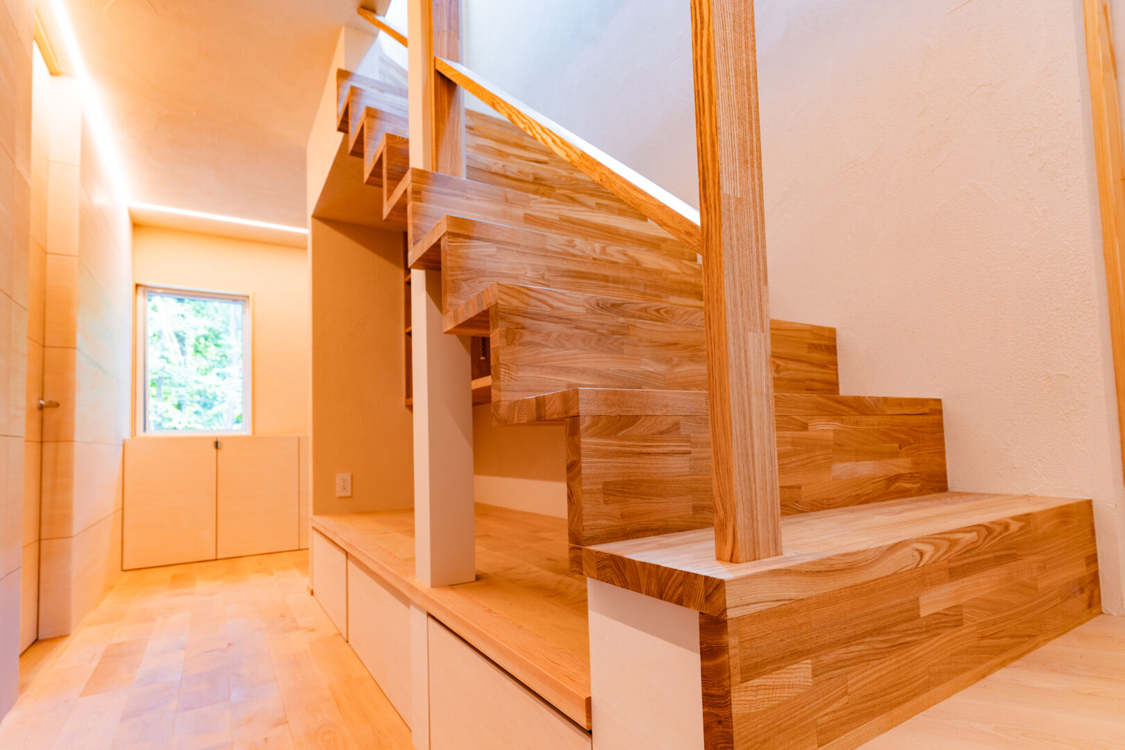 自然素材をふんだんに使い、木製窓やドア、棚、階段等は全て造作加工で職人の手仕事で仕上げられています。